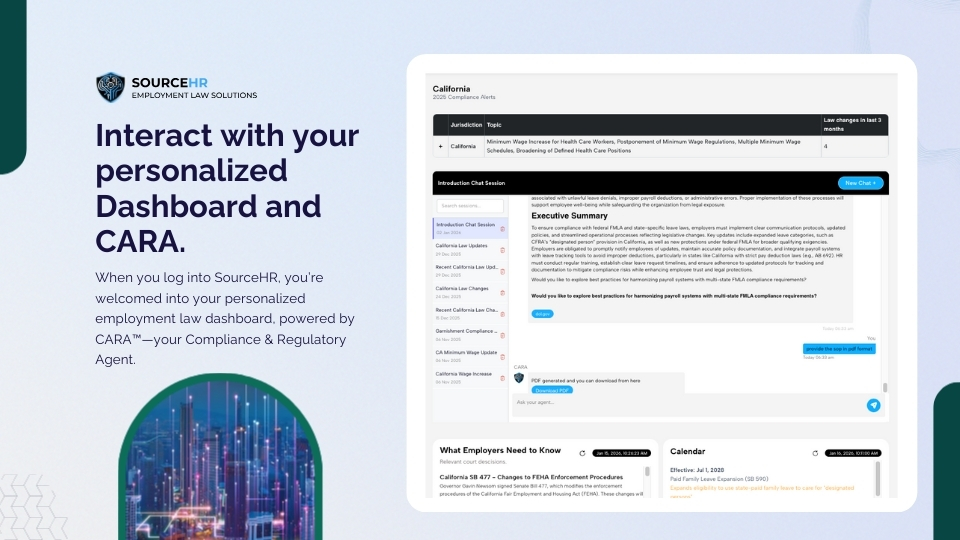 Go beyond Q&A. C.A.R.A. analyzes legislative trends, flags potential risks, and even recommends next steps — like updating your employee handbook or consulting counsel — before issues arise.